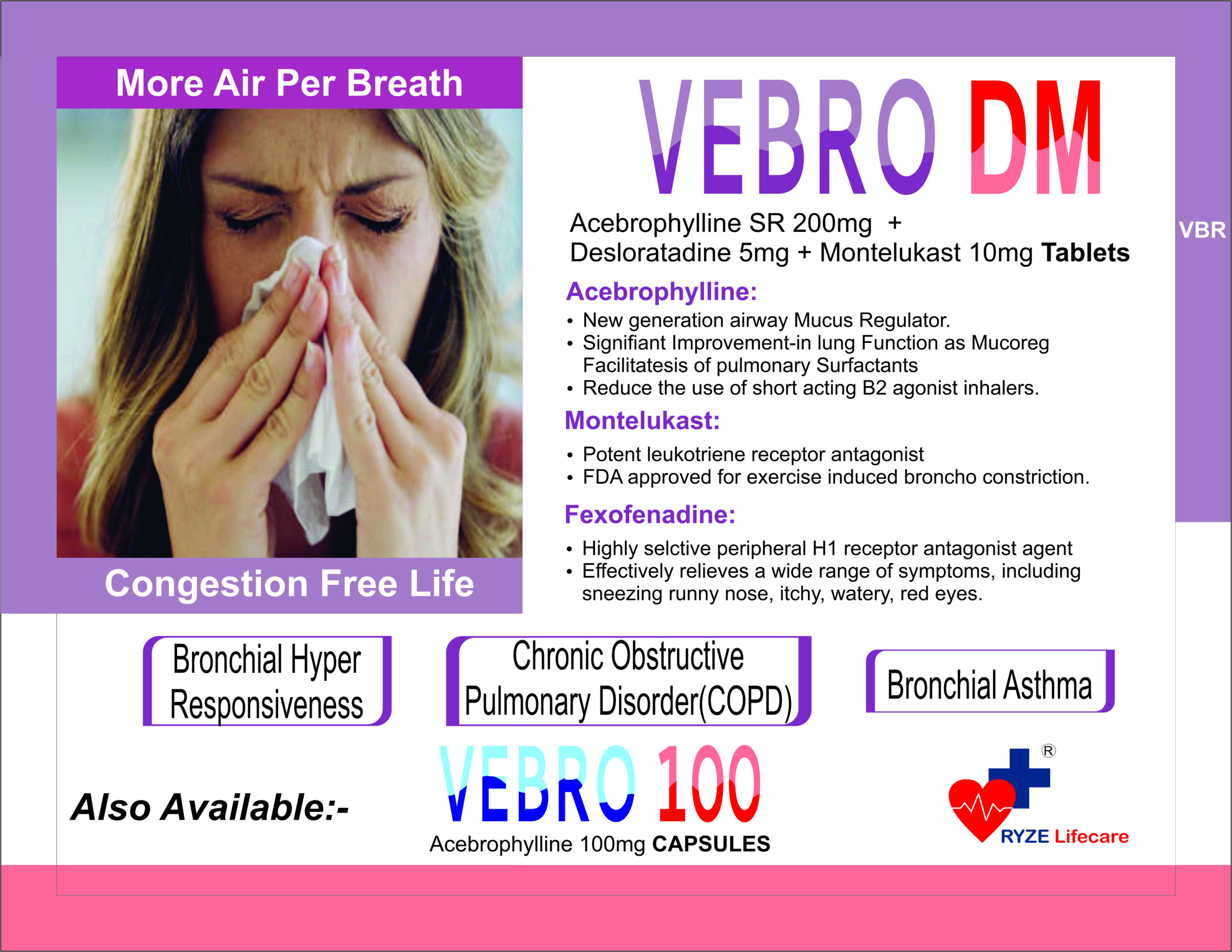 Acebrophylline SR 200mg + Desloratadine 5mg + Montelukast 10mg tab